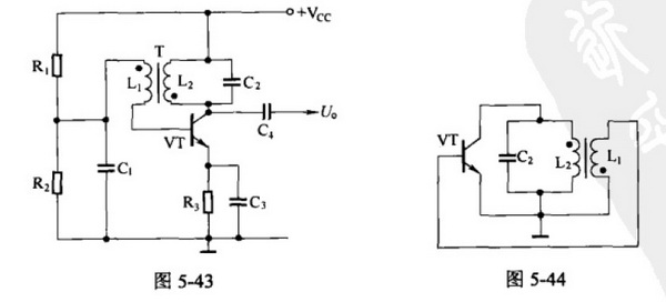 變壓器耦合振蕩器工作原理可用圖5-44說明:L2與C2組成的LC并聯諧振回路作為晶體管VT的集電極負載,VT的集電極輸出電壓通過變壓器T的振蕩線圈L2耦合至反饋線圈L1,從而又反饋至VT基極作為輸入電壓。由于晶體管VT的集電極電壓與基極電壓相位相反,所以變壓器T的兩個線圈L1與L2的同名端接法應相反,使變壓器T同時起到倒相作用,將集電極輸出電壓倒相后反饋給基極,實現了形成振蕩所必須的正反饋。因為并聯諧振回路在諧振時阻抗最大,且為純電路,所以只有諧振頻率fo能夠滿足相位條件而形成振蕩,這就是LC回路的選頻作用。