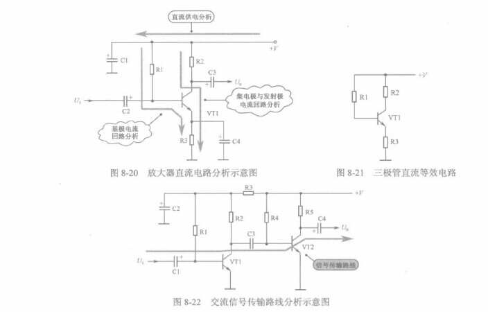 如圖8-20所示是放大器直流電路分析示意圖。對于一個單級放大器而言,其直流電路分析主要是圖8-20中所示的三個部分。